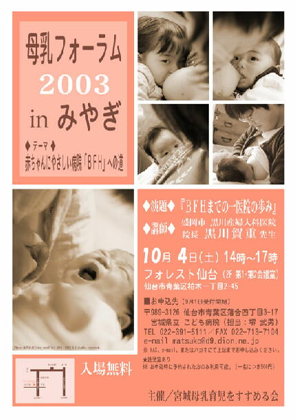 どうぞ、みなさまお誘い合わせて母乳フォーラム in みやぎ2003におこし頂き、みなさまの母乳育児への想いをお伝